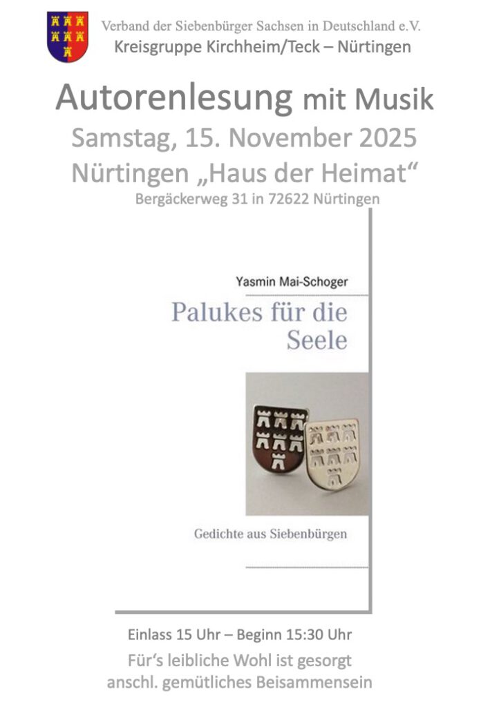 Autorenlesung am 26. April 2024 im Haus der Begegnung in Orschel Hagen (Reisen ohne Koffer) – Vergnüglich lächelnd in den Frühling – musikalischer Blumenstrauß mit Schmunzelgedichten. Schreibwerkstatt in der Stadtbibliothek im Zuge des Projektes „1000 Kissen für Reutlingen“ mit der Künstlerin Ute Diez. MitLeser beim Leseabend der GAL in Kirchentellinsfurt im August 2024 – „Emi und…“ aus dem Buch „WirrWarrWunder“ und Gedichte aus dem Buch „Schmunzelstücke II“. Autorenlesung am 01.12.2024 auf dem Goslarer Weihnachtsmarkt – „Goslarer Gosinde“ eine Geschichte über den immergrünen Harz – eine Geschichte über Hoffnung und über den Fluss Gose, der die Tränen der Trauer in Tränen der Hoffnung wandelt…..und ein extra gefasstes Gedicht über die wunderschöne Gose – als kleines „Geschenk“ an meine „Heimat“.